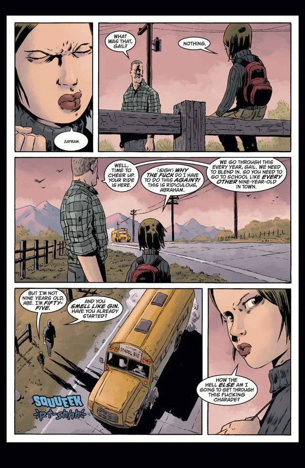 On Earth, Abe is Gail's pretend grandfather while in Spiral City they are heroes. Watching Abe try and keep this group -- mostly Gail -- together. Lemire has done such a damn good job with putting this intricately delicate yet deep relationship.